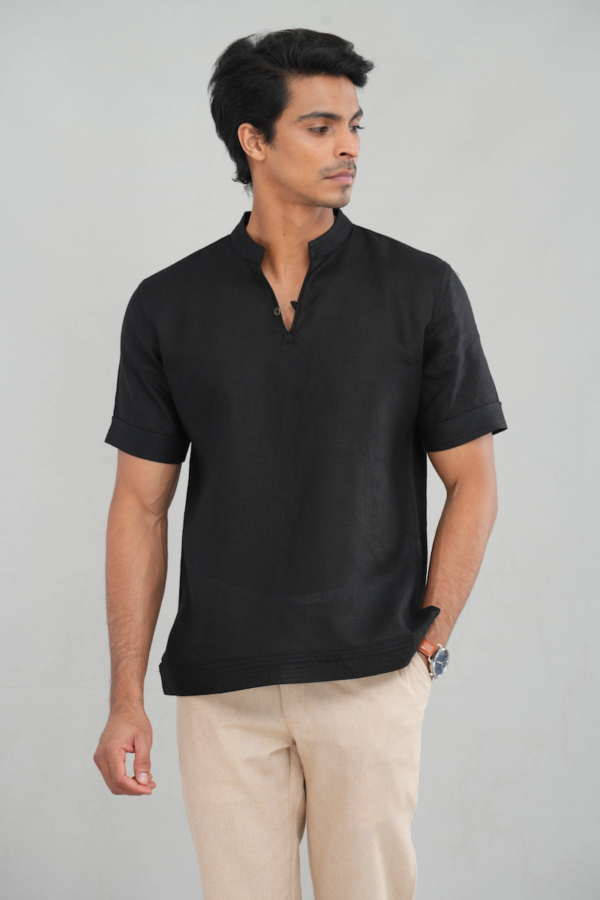 Introducing the Ceylon popover shirt. This shirt features a mandarin collar, short sleeves, and a wide-cut body for a modern look.