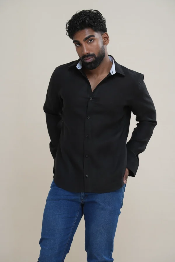 As elegant as it is versatile, this long sleeve linen shirt features a contrasting navy collar for a sophisticated touch. Lightweight and breathable, it’s perfect for both casual and semi-formal settings.