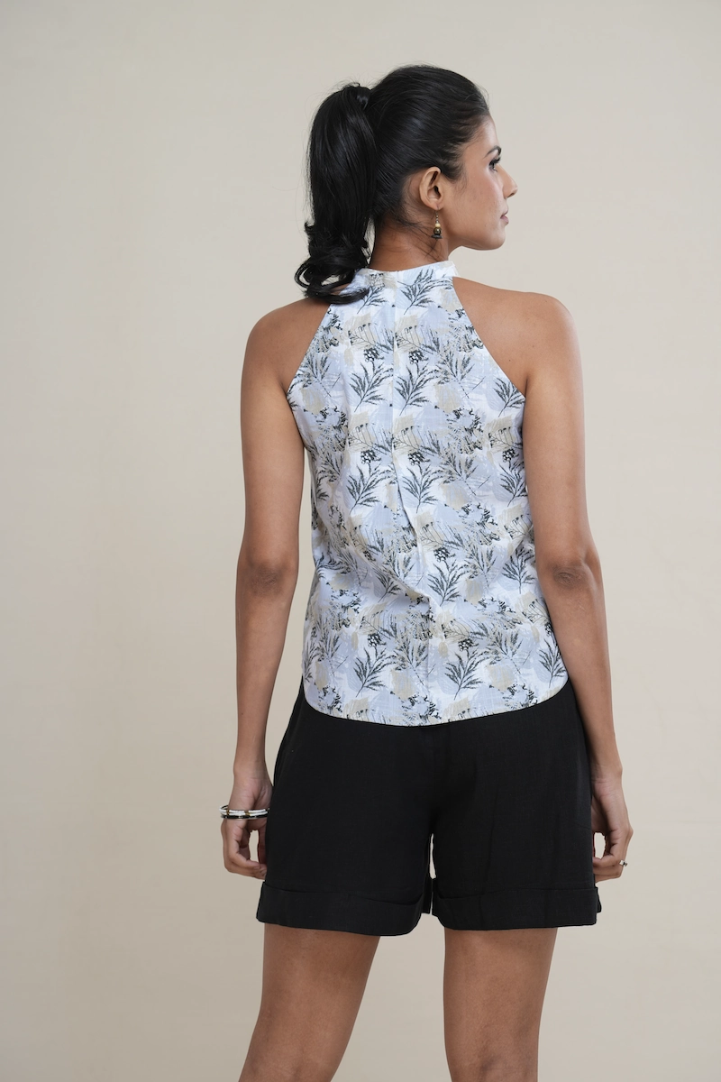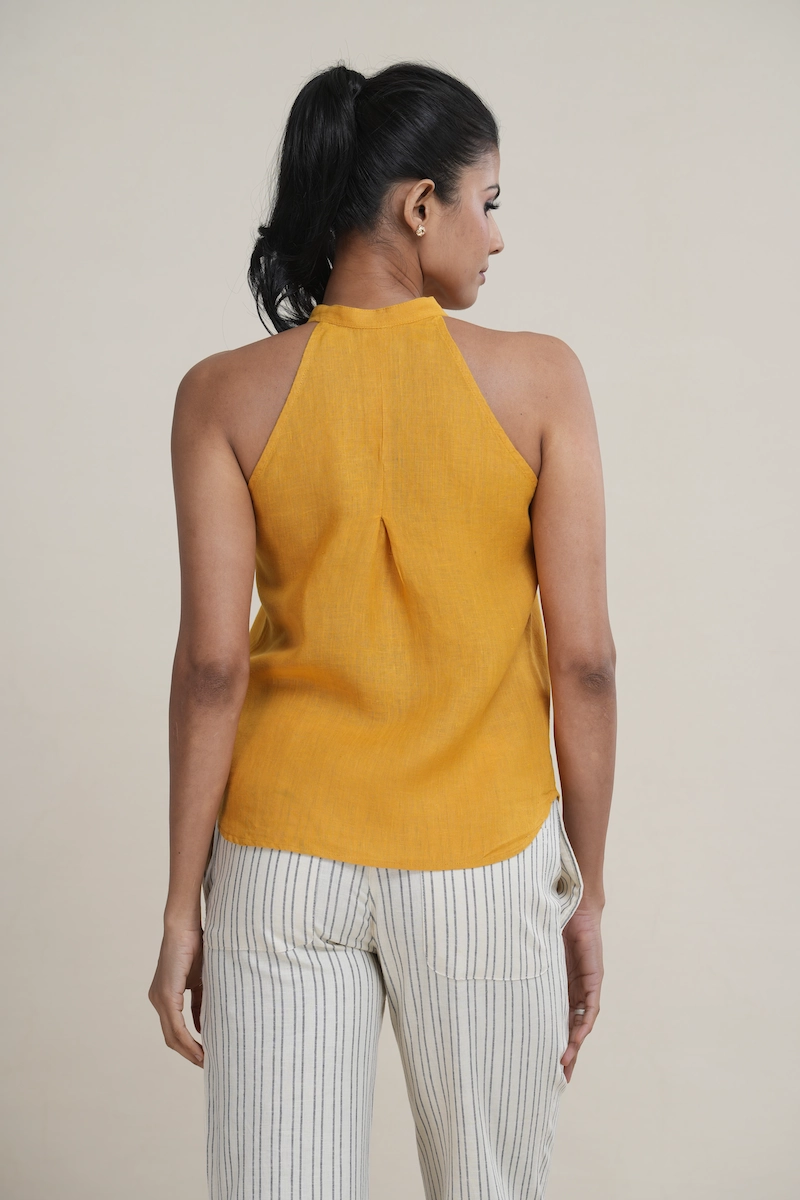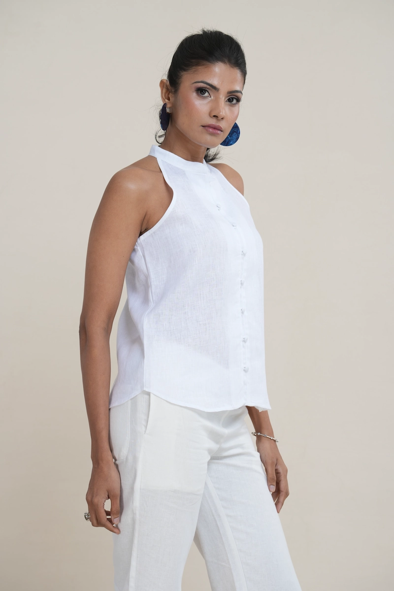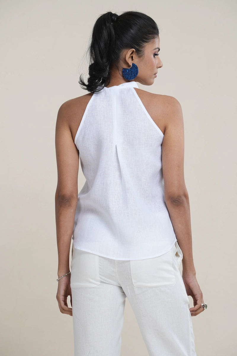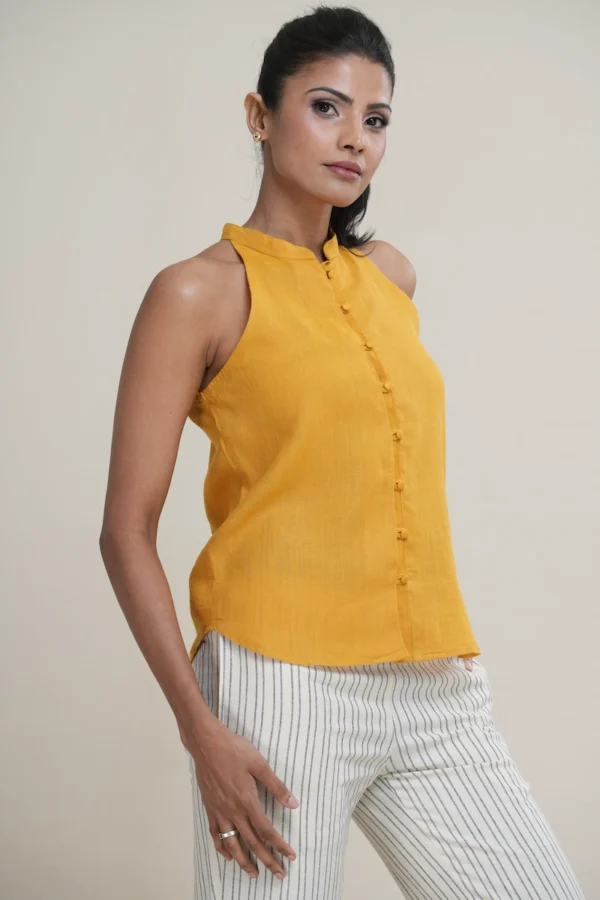 The Mandarin Collar Halter Top is a beautifully designed piece that merges contemporary style with classic details. Its standout feature is the unique neckline, which combines a sophisticated, stand-up Mandarin collar with a flattering halter cut that elegantly frames the shoulders. A full, functional button-front placket runs down the center, adding a touch of timeless blouse detailing. The silhouette is designed to be relaxed and slightly A-line, draping beautifully for a comfortable and breathable fit. It’s a versatile and chic top that can be easily dressed up or down for any occasion.