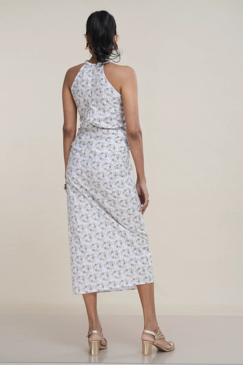 Neckline: A unique combination of a high, stand-up Mandarin collar and a shoulder-baring halter cut.